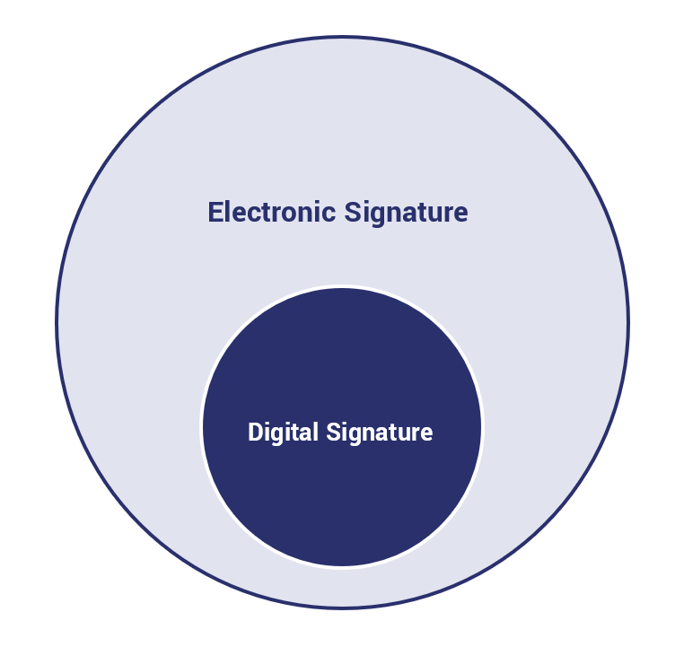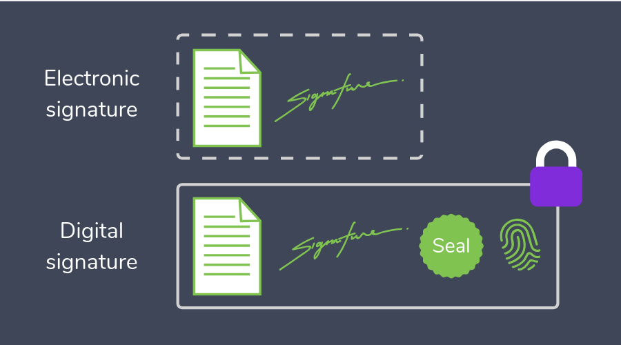 Về cốt lõi, chữ ký điện tử không nhất thiết phải là chữ ký. Nó có thể bao gồm âm thanh, biểu tượng hoặc quy trình được đính kèm với hợp đồng. Chúng bao gồm tất cả các chữ ký trực tuyến. Do đó chữ ký điện tử có định nghĩa rộng hơn chữ ký số.